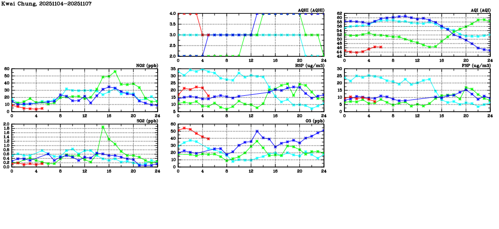 | Air Quality Data Time Series in Kwai Chung (2025/11/07) | ( Line colors: Day -3 Day -2 Day -1 Current day ) | 2D Map Current AQHI |