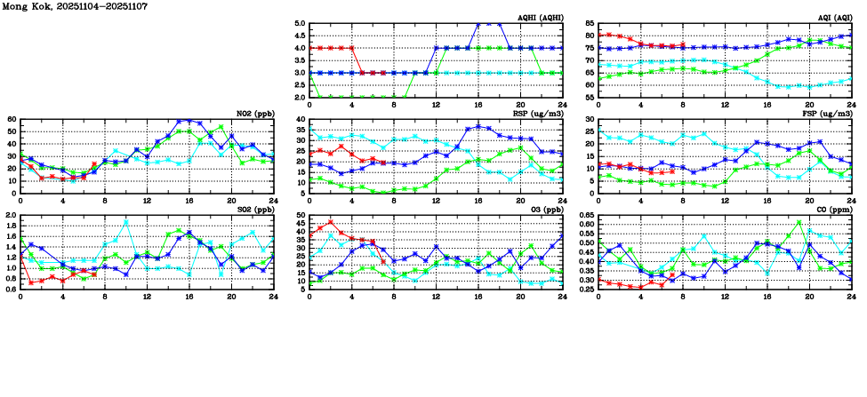 | Air Quality Data Time Series in Mong Kok (2025/11/07) | ( Line colors: Day -3 Day -2 Day -1 Current day ) | 2D Map Current AQHI |