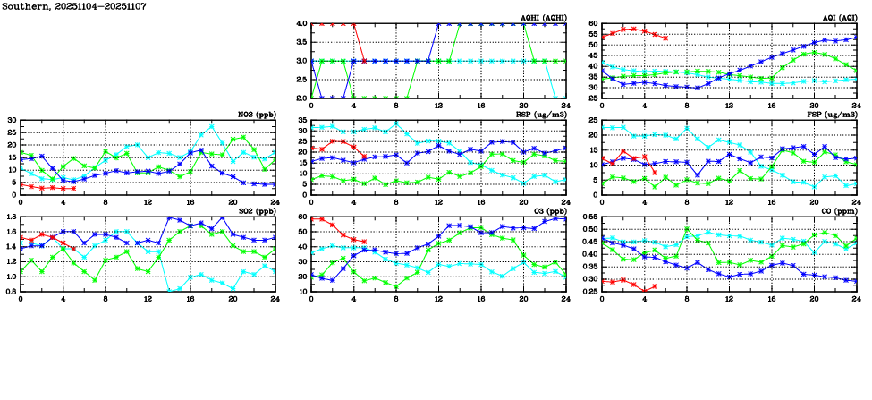 | Air Quality Data Time Series in Southern (2025/11/07) | ( Line colors: Day -3 Day -2 Day -1 Current day ) | 2D Map Current AQHI |