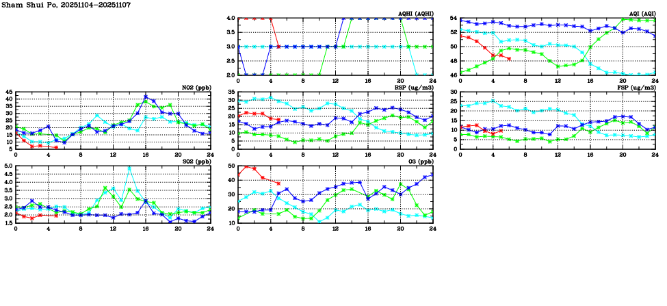 | Air Quality Data Time Series in Sham Shui Po (2025/11/07) | ( Line colors: Day -3 Day -2 Day -1 Current day ) | 2D Map Current AQHI |