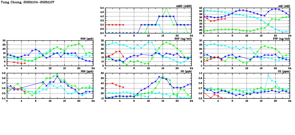 | Air Quality Data Time Series in Tung Chung (2025/11/07) | ( Line colors: Day -3 Day -2 Day -1 Current day ) | 2D Map Current AQHI |