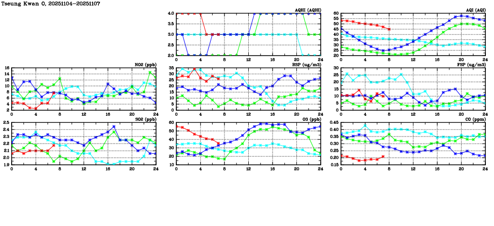 | Air Quality Data Time Series in Tseung Kwan O (2025/11/07) | ( Line colors: Day -3 Day -2 Day -1 Current day ) | 2D Map Current AQHI |
