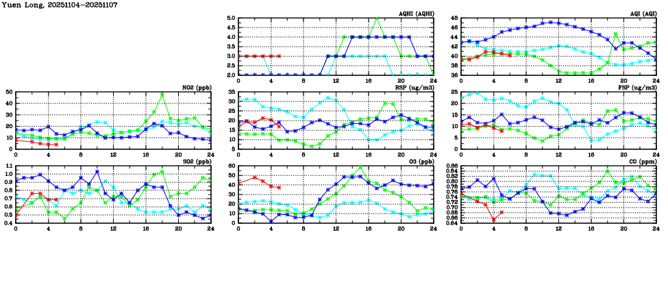 | Air Quality Data Time Series in Yuen Long (2025/11/07) | ( Line colors: Day -3 Day -2 Day -1 Current day ) | 2D Map Current AQHI |