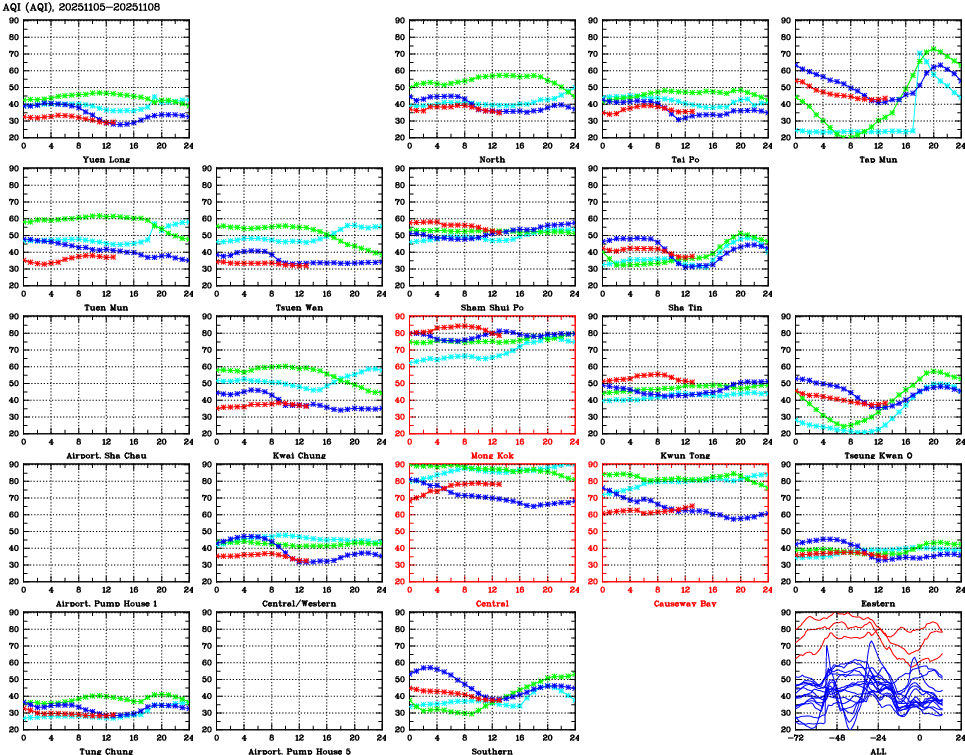 | Air Quality Data Time Series for AQI (2025/11/08) | ( Line colors: Day -3 Day -2 Day -1 Current day ) | 2D Map Current AQHI |