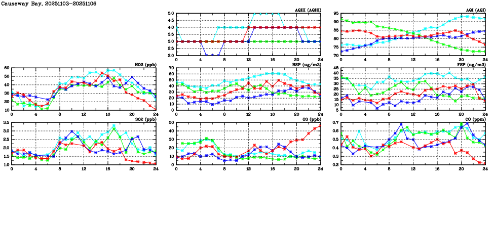 | Air Quality Data Time Series in Causeway Bay (2025/11/06) | ( Line colors: Day -3 Day -2 Day -1 Current day ) | 2D Map Current AQHI |