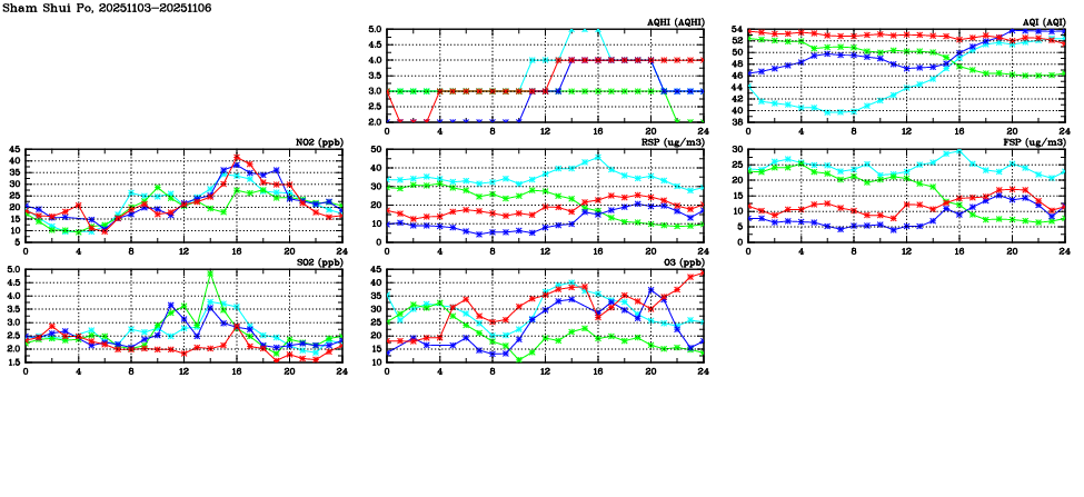 | Air Quality Data Time Series in Sham Shui Po (2025/11/06) | ( Line colors: Day -3 Day -2 Day -1 Current day ) | 2D Map Current AQHI |