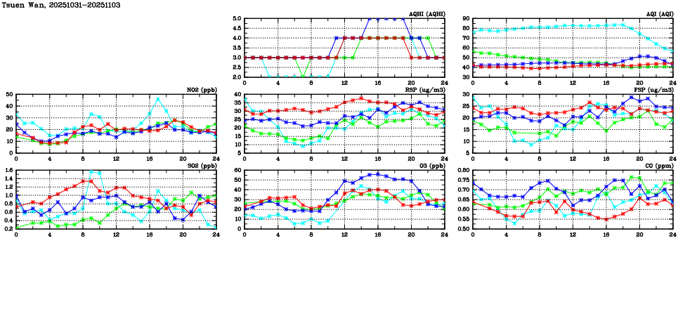 | Air Quality Data Time Series in Tsuen Wan (2025/11/03) | ( Line colors: Day -3 Day -2 Day -1 Current day ) | 2D Map Current AQHI |