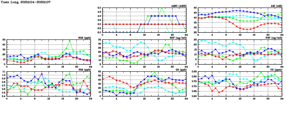 | Air Quality Data Time Series in Yuen Long (2025/11/07) | ( Line colors: Day -3 Day -2 Day -1 Current day ) | 2D Map Current AQHI |