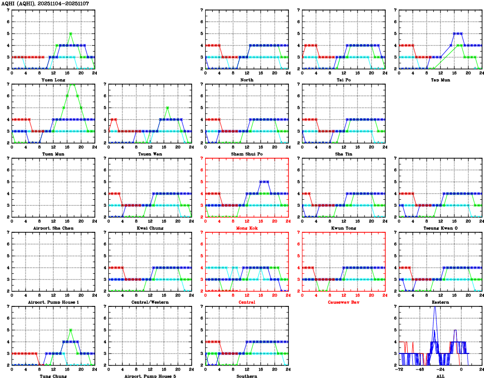 Air Quality Data Time Series for AQHI (2025/11/07) ( Line colors: Day -3 Day -2 Day -1 Current day ) 2D Map   Current AQHI