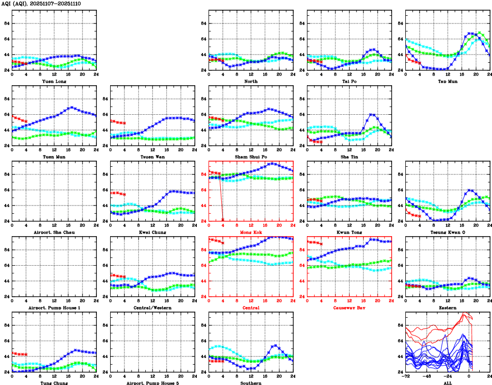 | Air Quality Data Time Series for AQI (2025/11/10) | ( Line colors: Day -3 Day -2 Day -1 Current day ) | 2D Map Current AQHI |