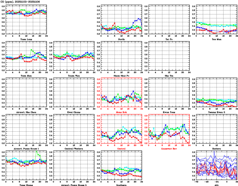 | Air Quality Data Time Series for CO (2025/11/06) | ( Line colors: Day -3 Day -2 Day -1 Current day ) | 2D Map Current AQHI |
