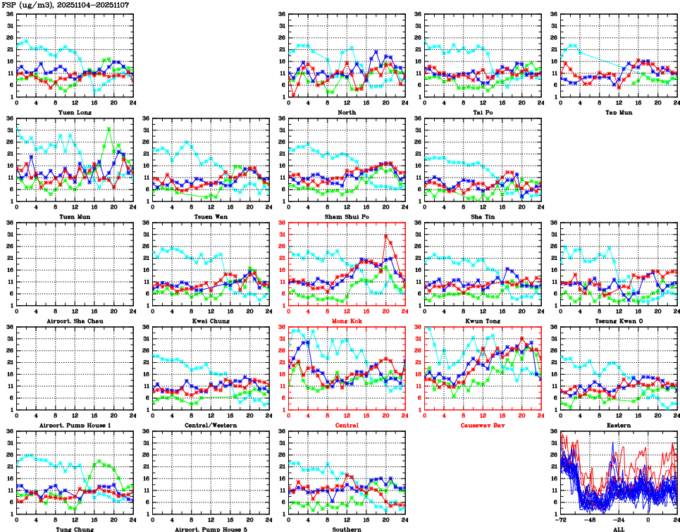 | Air Quality Data Time Series for FSP (2025/11/07) | ( Line colors: Day -3 Day -2 Day -1 Current day ) | 2D Map Current AQHI |