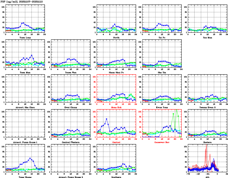 | Air Quality Data Time Series for FSP (2025/11/10) | ( Line colors: Day -3 Day -2 Day -1 Current day ) | 2D Map Current AQHI |
