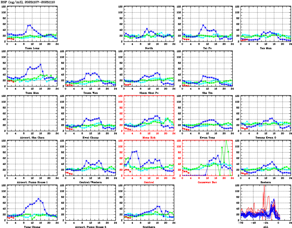 | Air Quality Data Time Series for RSP (2025/11/10) | ( Line colors: Day -3 Day -2 Day -1 Current day ) | 2D Map Current AQHI |