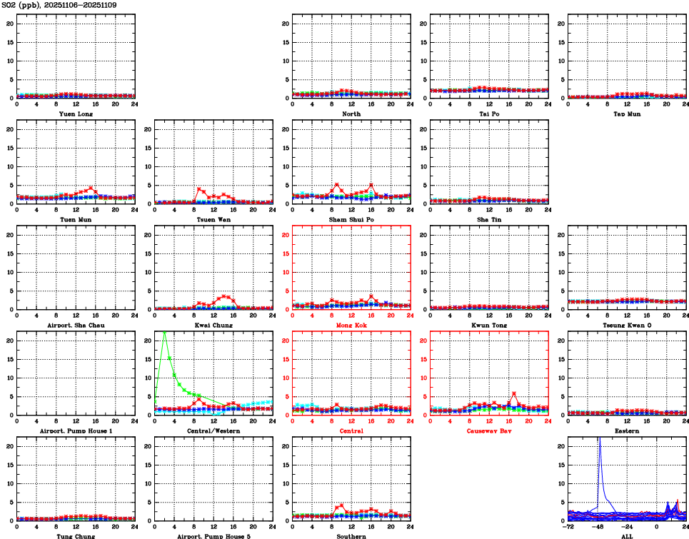| Air Quality Data Time Series for SO2 (2025/11/09) | ( Line colors: Day -3 Day -2 Day -1 Current day ) | 2D Map Current AQHI |