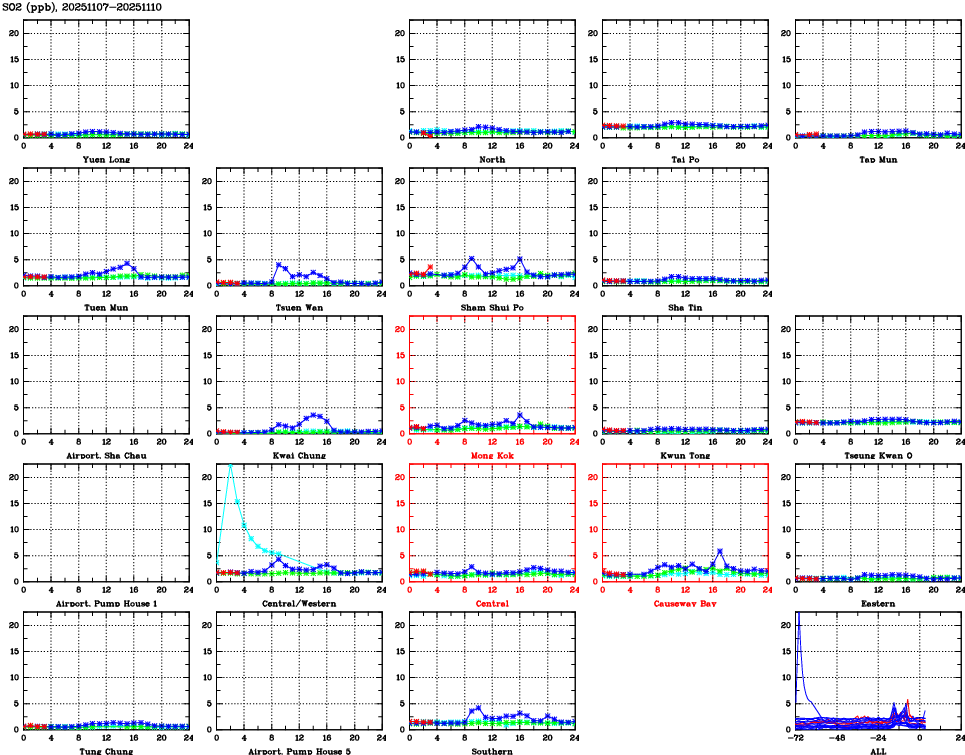 | Air Quality Data Time Series for SO2 (2025/11/10) | ( Line colors: Day -3 Day -2 Day -1 Current day ) | 2D Map Current AQHI |