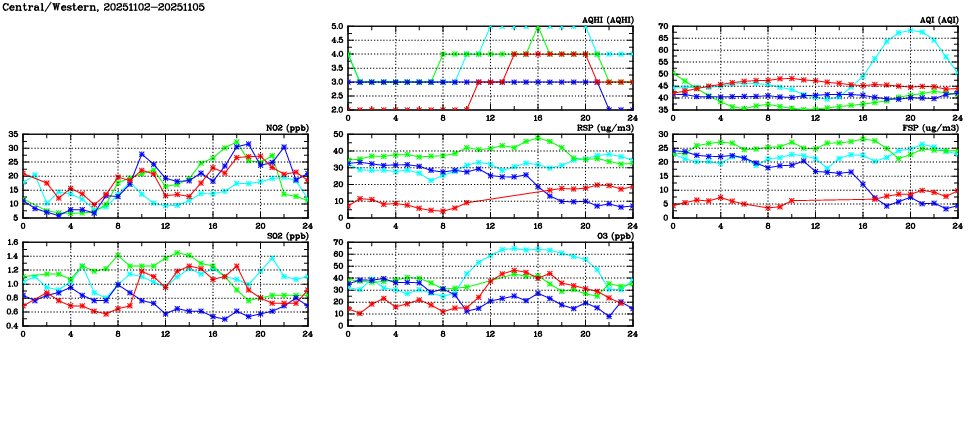 | Air Quality Data Time Series in Central/Western (2025/11/05) | ( Line colors: Day -3 Day -2 Day -1 Current day ) | 2D Map Current AQHI |