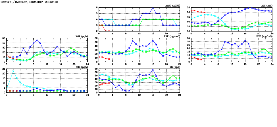 | Air Quality Data Time Series in Central/Western (2025/11/10) | ( Line colors: Day -3 Day -2 Day -1 Current day ) | 2D Map Current AQHI |