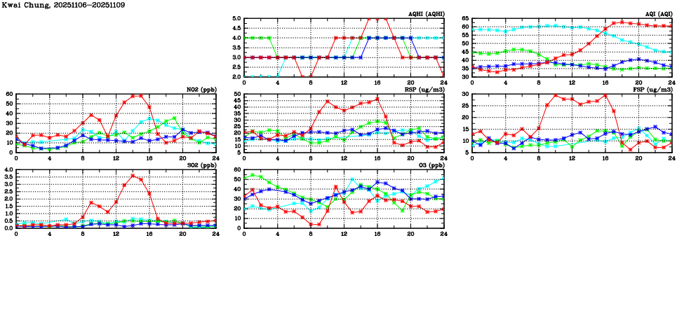 | Air Quality Data Time Series in Kwai Chung (2025/11/09) | ( Line colors: Day -3 Day -2 Day -1 Current day ) | 2D Map Current AQHI |