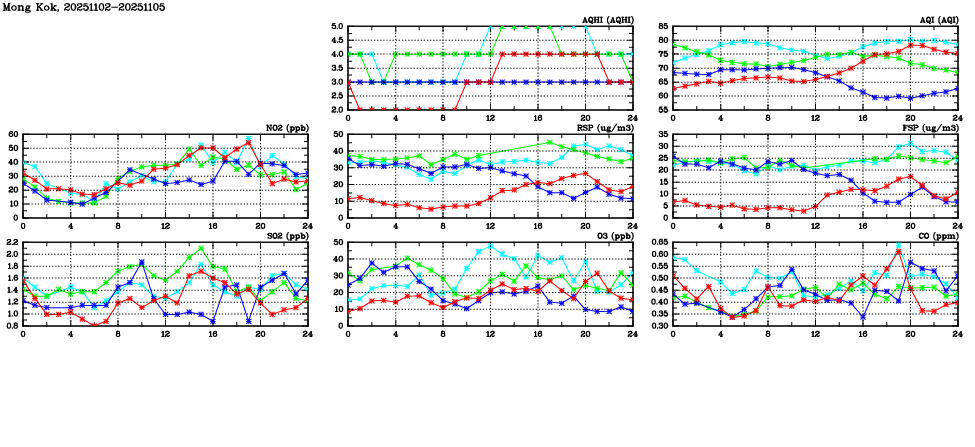 | Air Quality Data Time Series in Mong Kok (2025/11/05) | ( Line colors: Day -3 Day -2 Day -1 Current day ) | 2D Map Current AQHI |