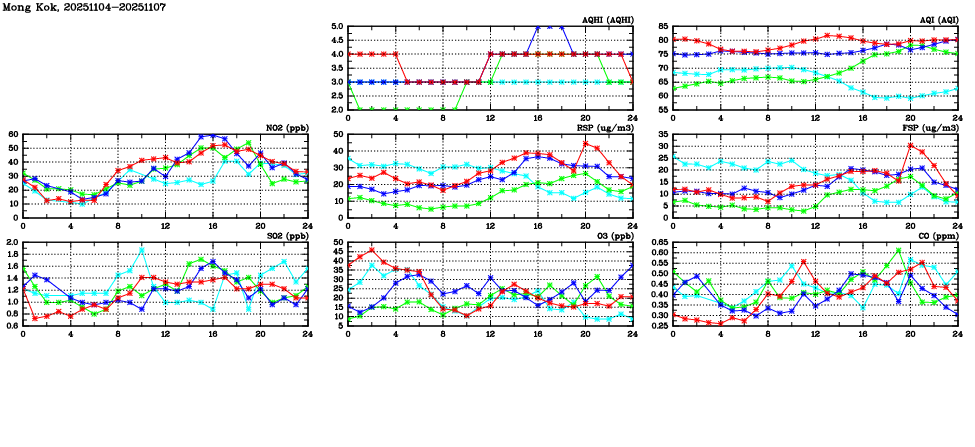 | Air Quality Data Time Series in Mong Kok (2025/11/07) | ( Line colors: Day -3 Day -2 Day -1 Current day ) | 2D Map Current AQHI |