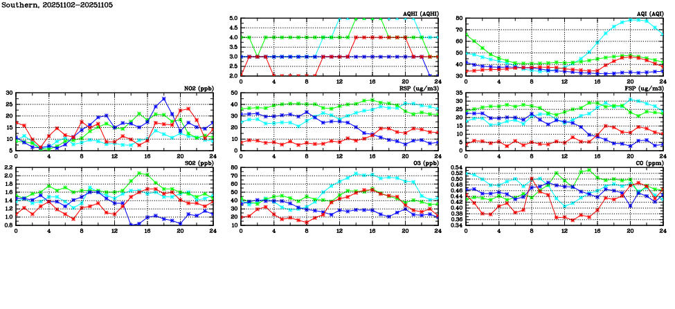 | Air Quality Data Time Series in Southern (2025/11/05) | ( Line colors: Day -3 Day -2 Day -1 Current day ) | 2D Map Current AQHI |