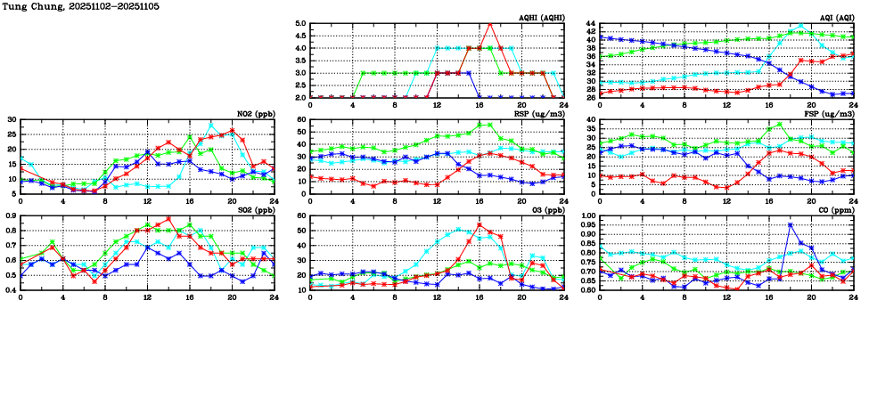 | Air Quality Data Time Series in Tung Chung (2025/11/05) | ( Line colors: Day -3 Day -2 Day -1 Current day ) | 2D Map Current AQHI |