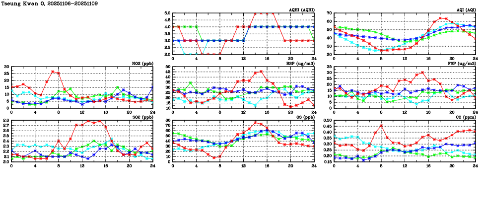 | Air Quality Data Time Series in Tseung Kwan O (2025/11/09) | ( Line colors: Day -3 Day -2 Day -1 Current day ) | 2D Map Current AQHI |