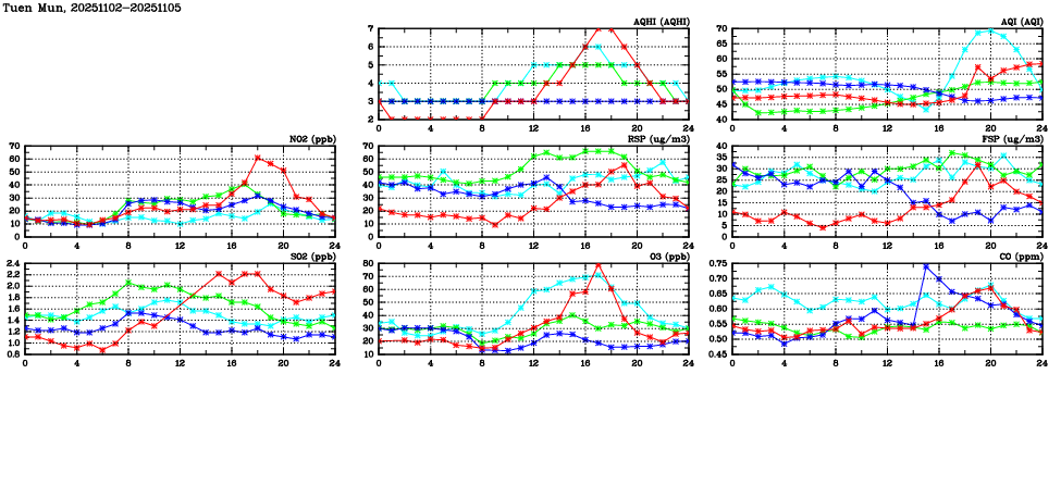 | Air Quality Data Time Series in Tuen Mun (2025/11/05) | ( Line colors: Day -3 Day -2 Day -1 Current day ) | 2D Map Current AQHI |
