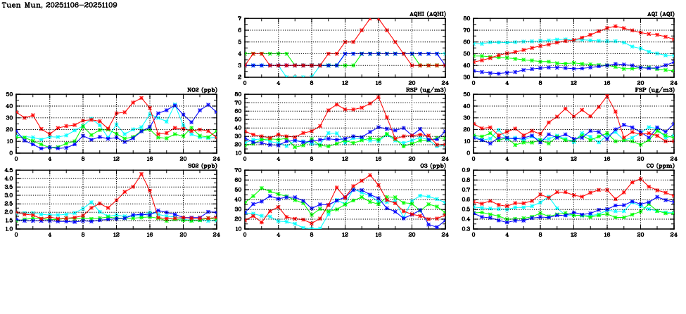 | Air Quality Data Time Series in Tuen Mun (2025/11/09) | ( Line colors: Day -3 Day -2 Day -1 Current day ) | 2D Map Current AQHI |