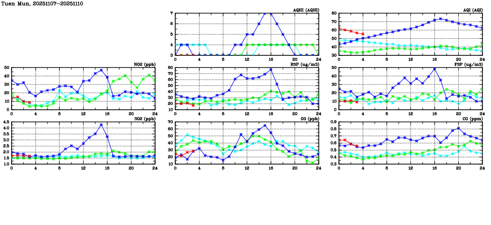 | Air Quality Data Time Series in Tuen Mun (2025/11/10) | ( Line colors: Day -3 Day -2 Day -1 Current day ) | 2D Map Current AQHI |