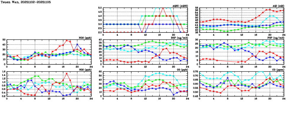 | Air Quality Data Time Series in Tsuen Wan (2025/11/05) | ( Line colors: Day -3 Day -2 Day -1 Current day ) | 2D Map Current AQHI |