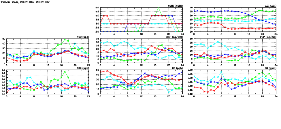 | Air Quality Data Time Series in Tsuen Wan (2025/11/07) | ( Line colors: Day -3 Day -2 Day -1 Current day ) | 2D Map Current AQHI |