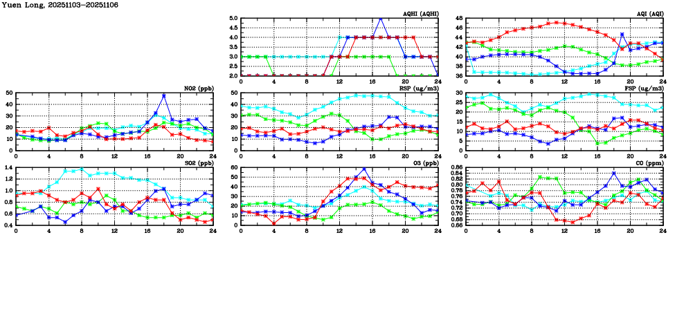 | Air Quality Data Time Series in Yuen Long (2025/11/06) | ( Line colors: Day -3 Day -2 Day -1 Current day ) | 2D Map Current AQHI |