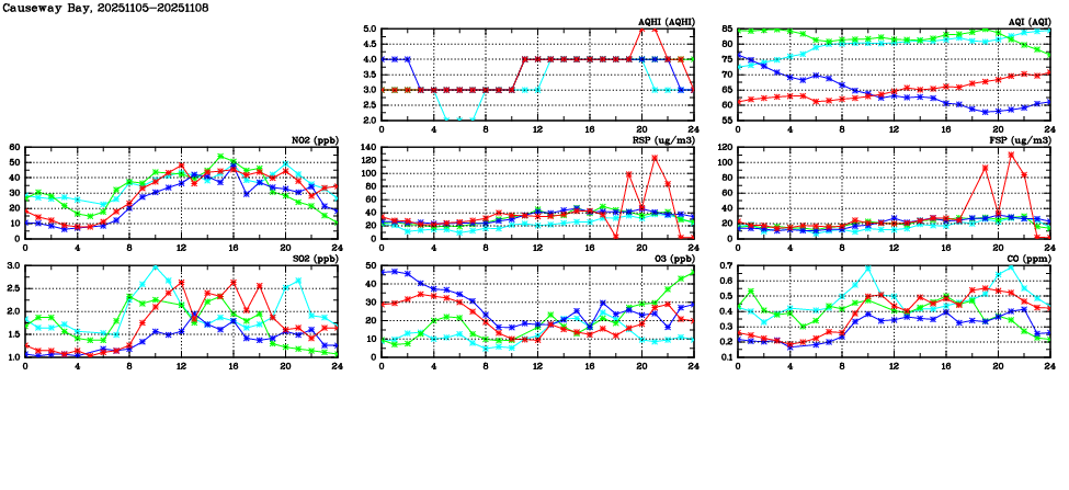 | Air Quality Data Time Series in Causeway Bay (2025/11/08) | ( Line colors: Day -3 Day -2 Day -1 Current day ) | 2D Map Current AQHI |