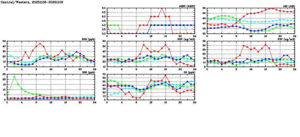 | Air Quality Data Time Series in Central/Western (2025/11/09) | ( Line colors: Day -3 Day -2 Day -1 Current day ) | 2D Map Current AQHI |