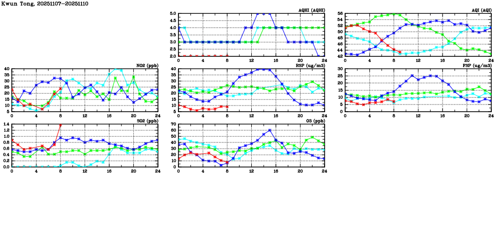 | Air Quality Data Time Series in Kwun Tong (2025/11/10) | ( Line colors: Day -3 Day -2 Day -1 Current day ) | 2D Map Current AQHI |