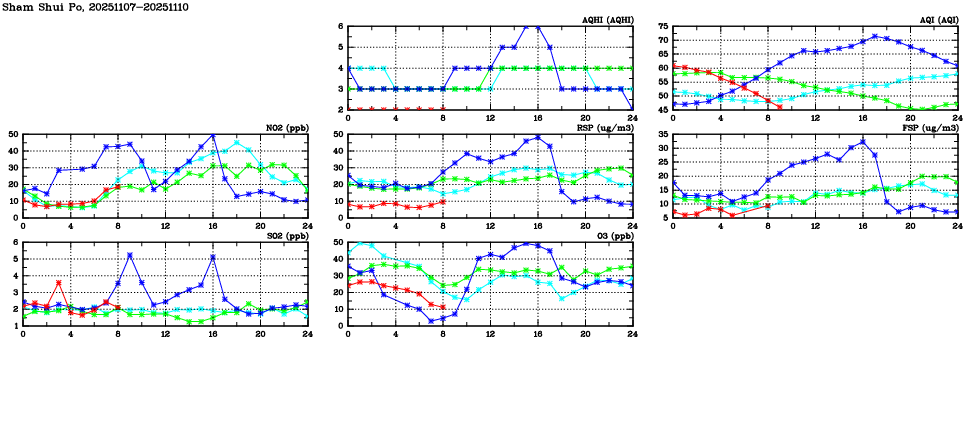 | Air Quality Data Time Series in Sham Shui Po (2025/11/10) | ( Line colors: Day -3 Day -2 Day -1 Current day ) | 2D Map Current AQHI |