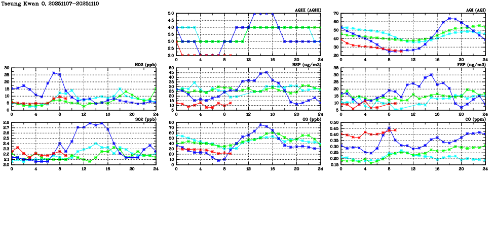 | Air Quality Data Time Series in Tseung Kwan O (2025/11/10) | ( Line colors: Day -3 Day -2 Day -1 Current day ) | 2D Map Current AQHI |