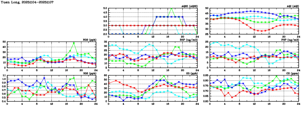 | Air Quality Data Time Series in Yuen Long (2025/11/07) | ( Line colors: Day -3 Day -2 Day -1 Current day ) | 2D Map Current AQHI |
