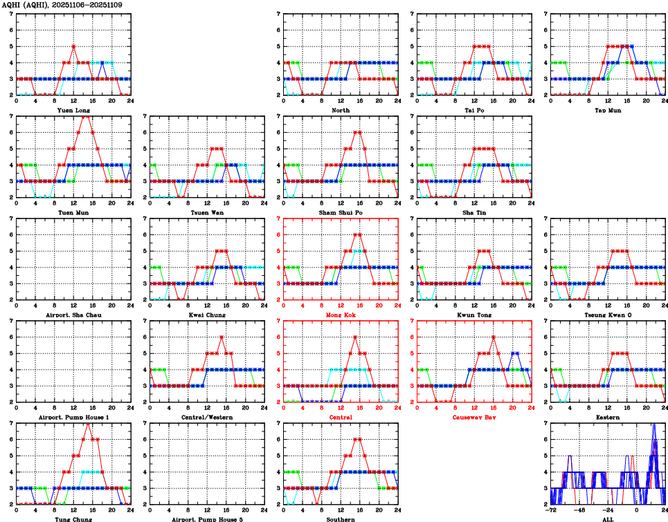 | Air Quality Data Time Series for AQHI (2025/11/09) | ( Line colors: Day -3 Day -2 Day -1 Current day ) | 2D Map Current AQHI |