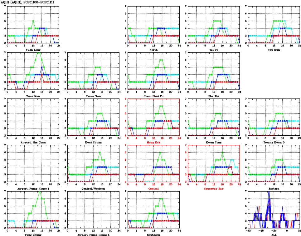 | Air Quality Data Time Series for AQHI (2025/11/11) | ( Line colors: Day -3 Day -2 Day -1 Current day ) | 2D Map Current AQHI |