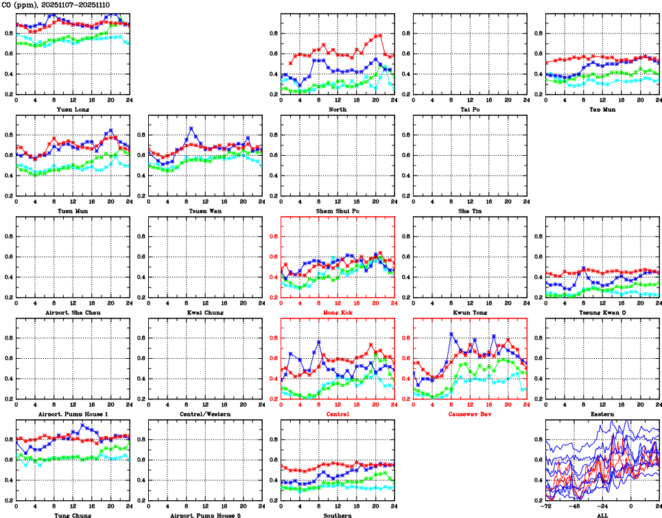 | Air Quality Data Time Series for CO (2025/11/10) | ( Line colors: Day -3 Day -2 Day -1 Current day ) | 2D Map Current AQHI |