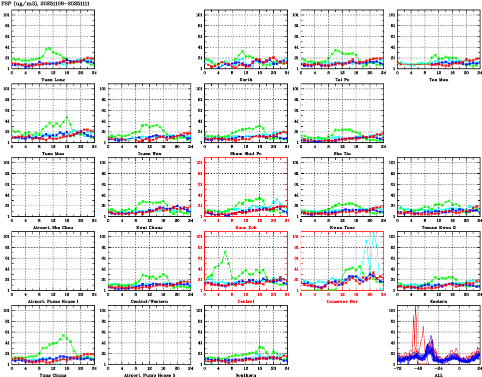 | Air Quality Data Time Series for FSP (2025/11/11) | ( Line colors: Day -3 Day -2 Day -1 Current day ) | 2D Map Current AQHI |