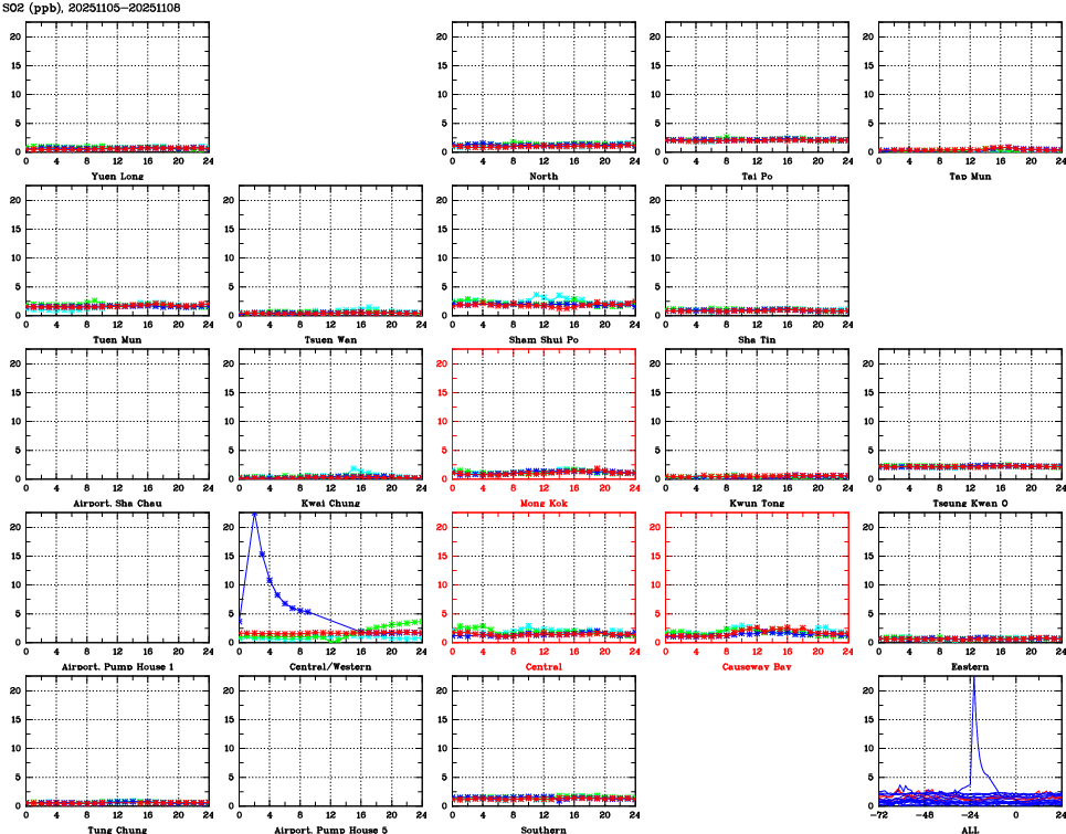 | Air Quality Data Time Series for SO2 (2025/11/08) | ( Line colors: Day -3 Day -2 Day -1 Current day ) | 2D Map Current AQHI |