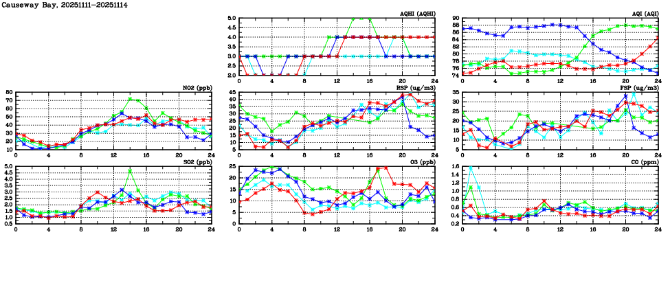 | Air Quality Data Time Series in Causeway Bay (2025/11/14) | ( Line colors: Day -3 Day -2 Day -1 Current day ) | 2D Map Current AQHI |