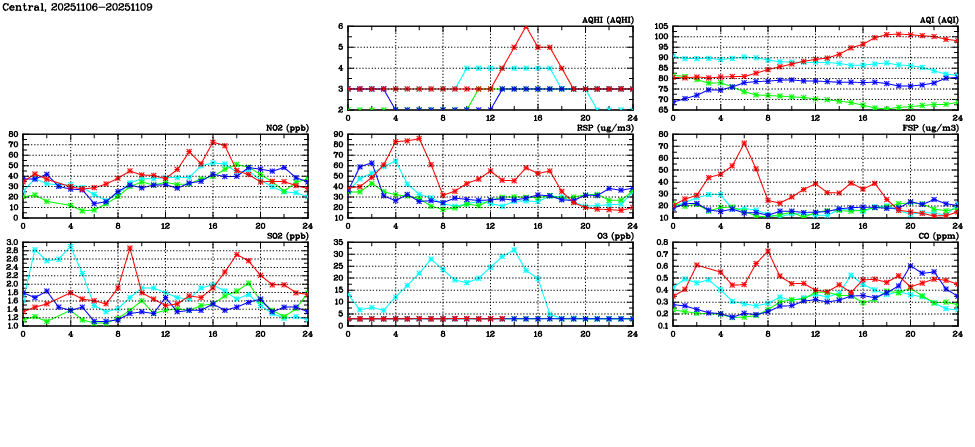 | Air Quality Data Time Series in Central (2025/11/09) | ( Line colors: Day -3 Day -2 Day -1 Current day ) | 2D Map Current AQHI |