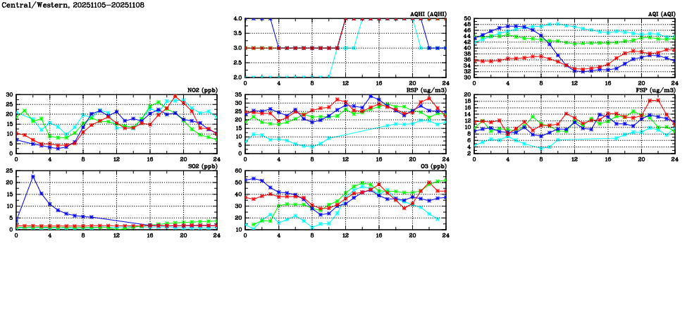 | Air Quality Data Time Series in Central/Western (2025/11/08) | ( Line colors: Day -3 Day -2 Day -1 Current day ) | 2D Map Current AQHI |