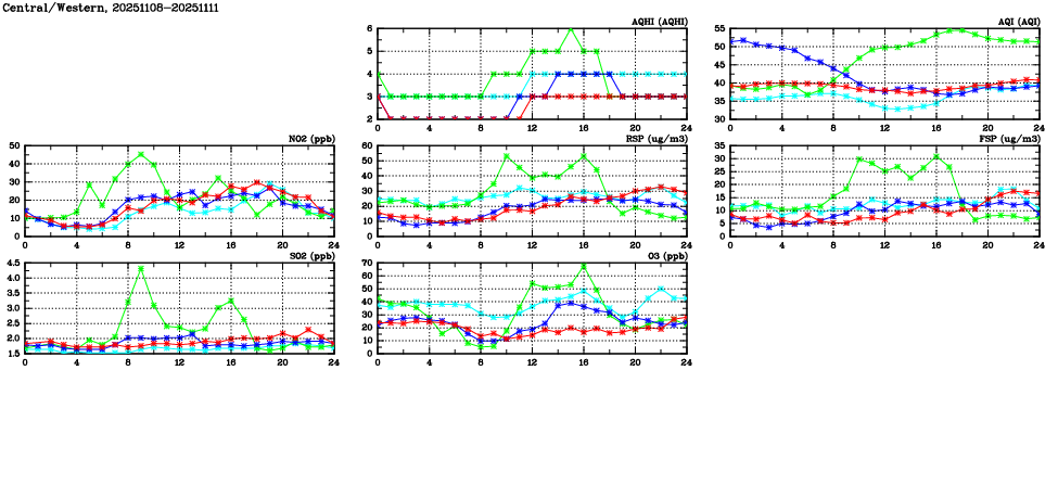 | Air Quality Data Time Series in Central/Western (2025/11/11) | ( Line colors: Day -3 Day -2 Day -1 Current day ) | 2D Map Current AQHI |