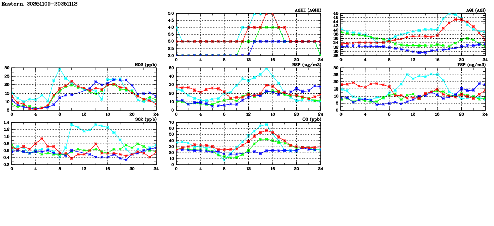 | Air Quality Data Time Series in Eastern (2025/11/12) | ( Line colors: Day -3 Day -2 Day -1 Current day ) | 2D Map Current AQHI |